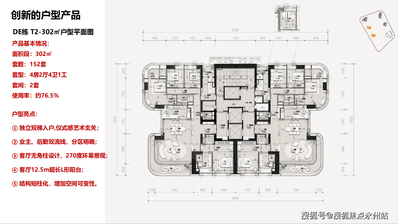 302㎡四房四卫+家政套间:分布在D栋和E栋,3梯2户都有双门梯专梯入户,每层层高3.5米,01和02户主要是因为核心筒的结构影响了家政套间和生活阳台的差异,区别并不大。