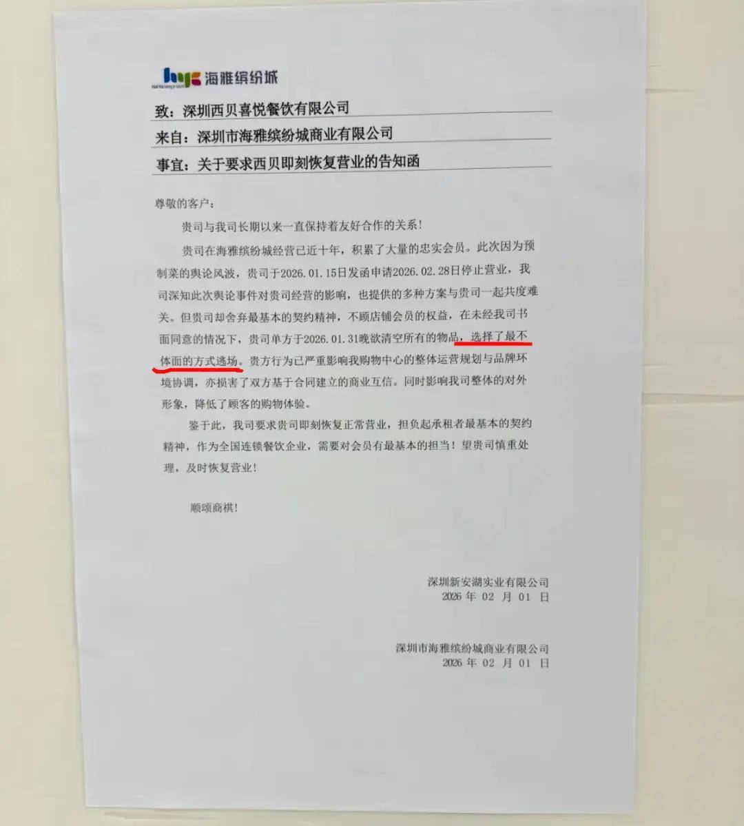 网友发布的照片显示,一份要求深圳西贝喜悦餐饮有限公司即刻恢复营业的告知函写道,该公司在海雅缤纷城经营已近十年,积累了大量的忠实会员。此次因为预制菜的舆论风波,该公司于2026年1月15日向商场发函申请2026年2月28日停止营业,商场深知此次舆论事件对公司经营的影响,也提供多种方案与公司一起共渡难关。“但该公司却舍弃最基本的契约精神,不顾店铺会员的权益,在未经我司书面同意的情况下,贵司单方于2026年1月31日晚欲清空所有的物品,选择了最不体面的方式逃场。”