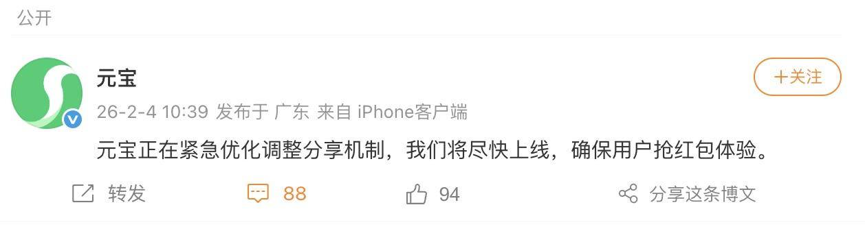 对于微信方面的处置,元宝随即回应称:“正在紧急优化调整分享机制,我们将尽快上线,确保用户抢红包体验。 ”
