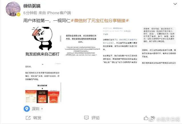 2月4日上午,微信安全中心发布了关于第三方诱导分享行为的打击公告,指出微信收到了用户针对元宝的反馈和投诉,其相关春节营销活动存在通过做任务领红包等方式诱导用户高频分享链接到微信群等场景,干扰平台生态秩序,影响用户体验,对用户造成骚扰,根据《微信外部链接内容管理规范》,对元宝的违规链接进行处置,限制其在微信内直接打开。