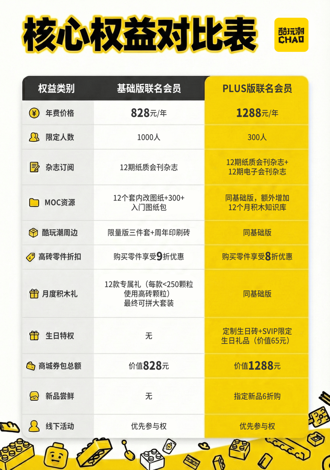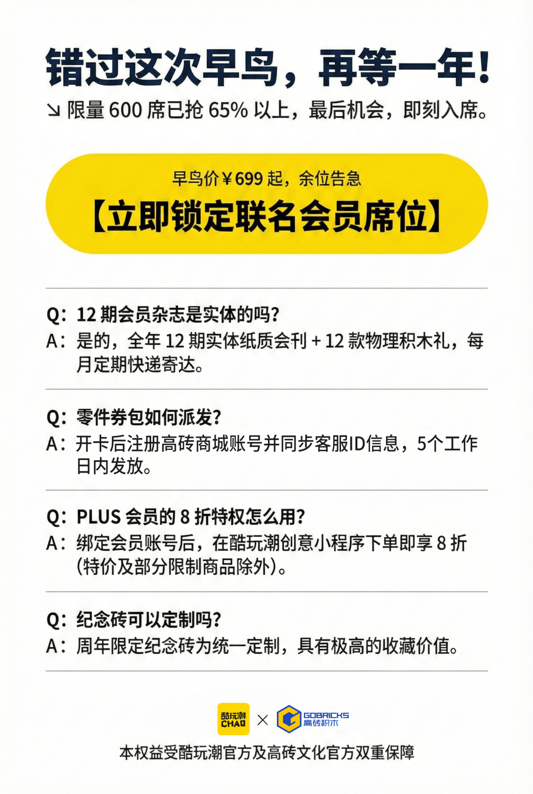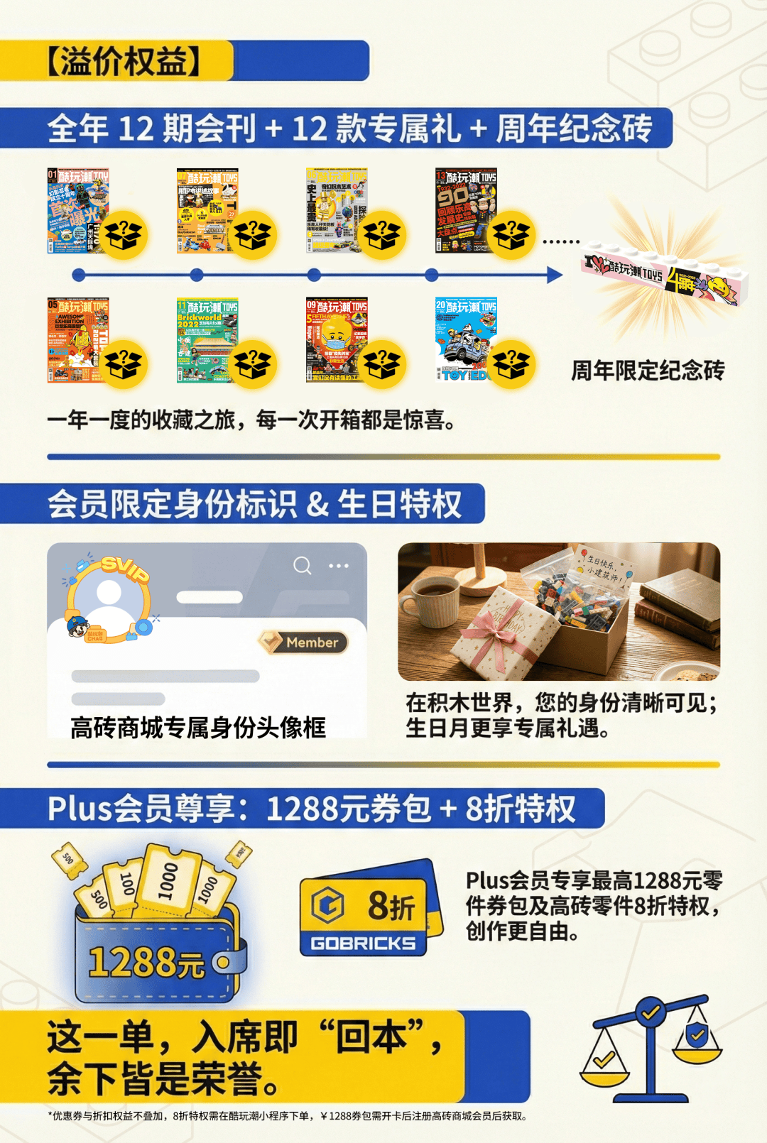 这份联名会员席位,是酷玩潮和高砖合力打造的积木玩家“MOC执照”:除了全年 12 期实体杂志与 12 款配套 MOC 零件礼包,PLUS 版更包含价值 1288 元的零件券包、高砖零件 8 折特权、酷玩潮珍贵的周年限定纪念砖,以及酷玩潮独家的硬核乐高 AI 知识库;针对老订户,我们支持续费日期自动顺延(具体效期可随时找客服“小酷”核实)——这一单,入席即回本,余下皆是快乐。