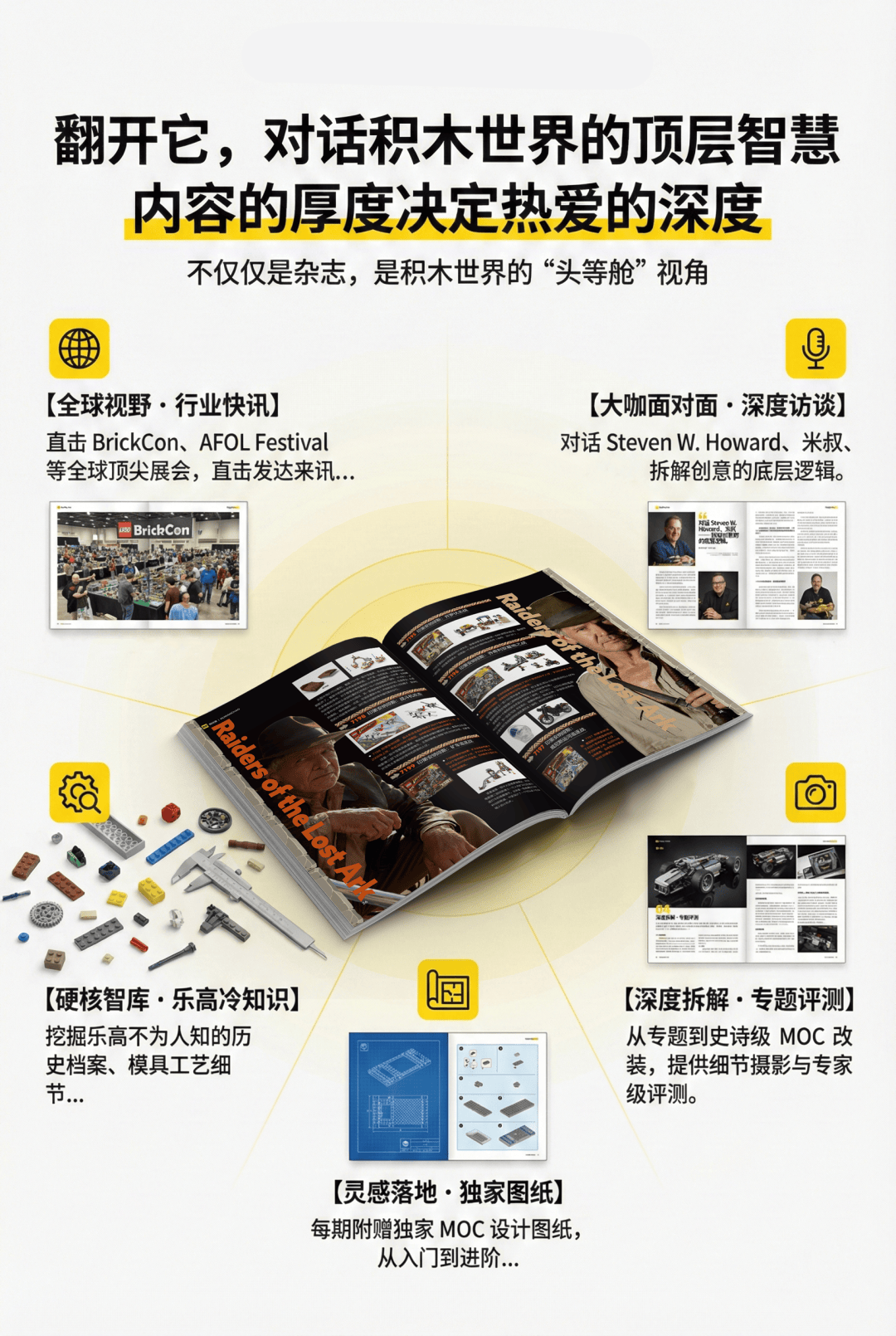 每期附赠的积木一向都是各位会员与读者关心的部分。现在联手高砖,我们将随刊赠品升级为“月度积木礼”,每期推出一档高砖颗粒的MOC积木包(250颗粒内)。