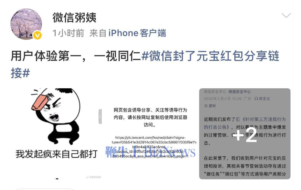 微信安全中心发布公告进行回应:收到用户针对元宝的反馈和投诉,其相关春节营销活动存在通过“做任务”“领红包”等方式诱导用户高频分享链接到微信群等场景,干扰平台生态秩序、影响用户体验、对用户造成骚扰。
