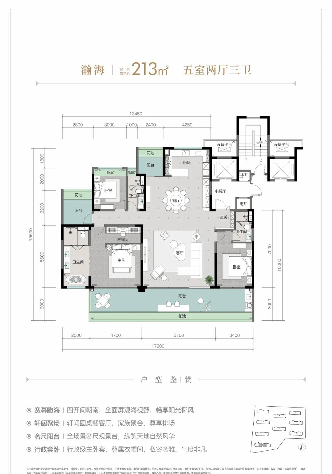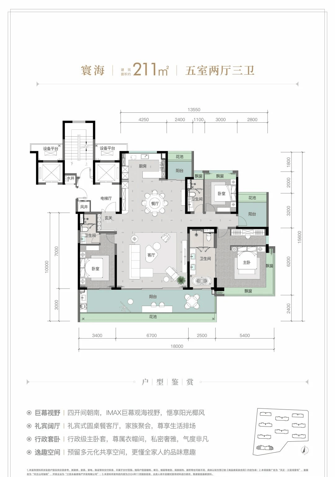 规划建筑面积约126-213㎡观海奢装大平层,约3.1米阔绰层高,部分户型创新设计270°全景飘窗主卧套。
