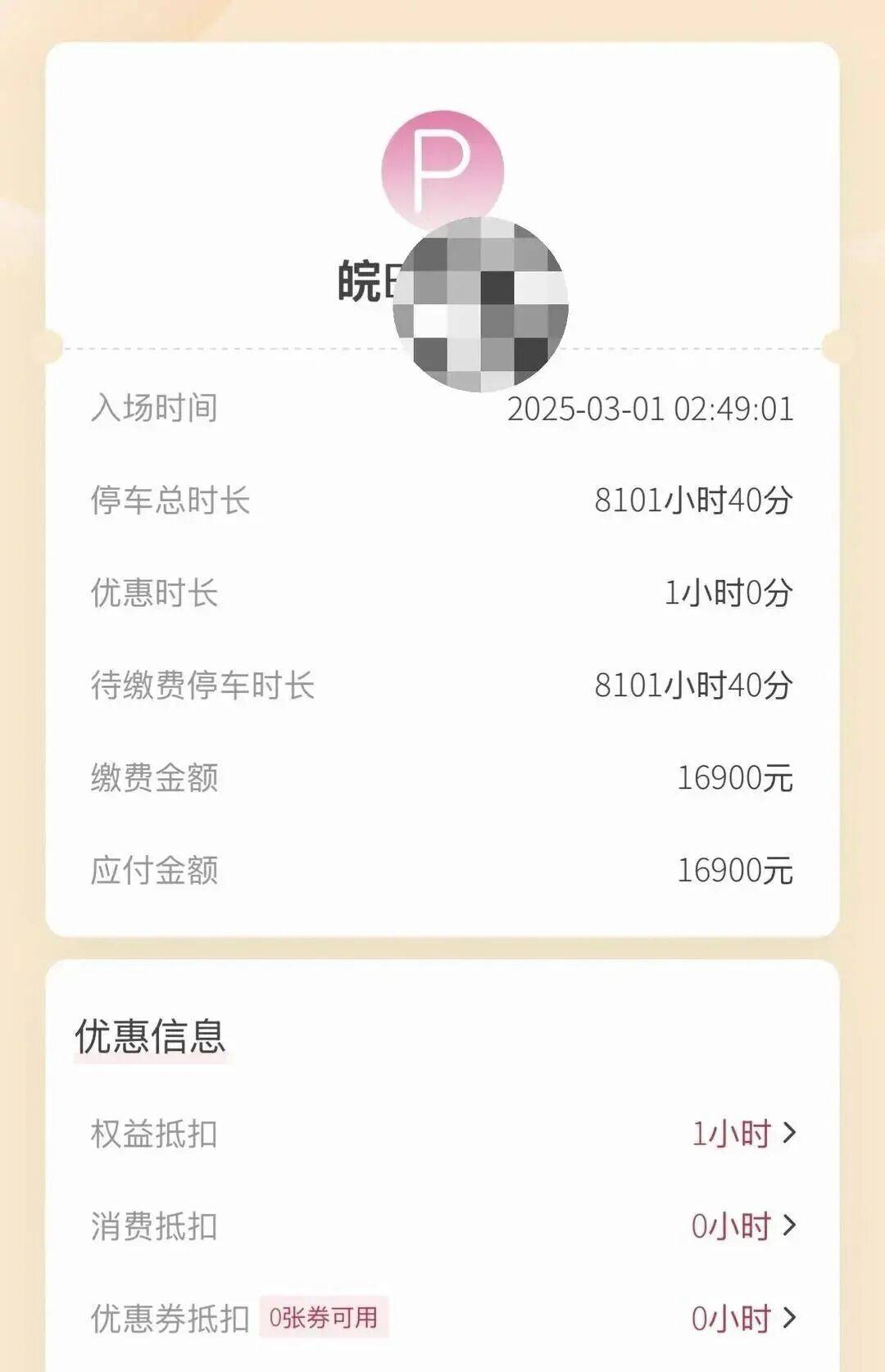 记者从网传的图片上看到,这辆黑色的皖牌宝马四周都是围栏,后窗上还贴有一张纸,上面写着,“移车请联系水晶城消控24小时值班电话……”。而另一张图片上可见,该车入场时间是2025年3月1日凌晨2点多,停车总时长达到了8101小时,缴费金额为16900元。