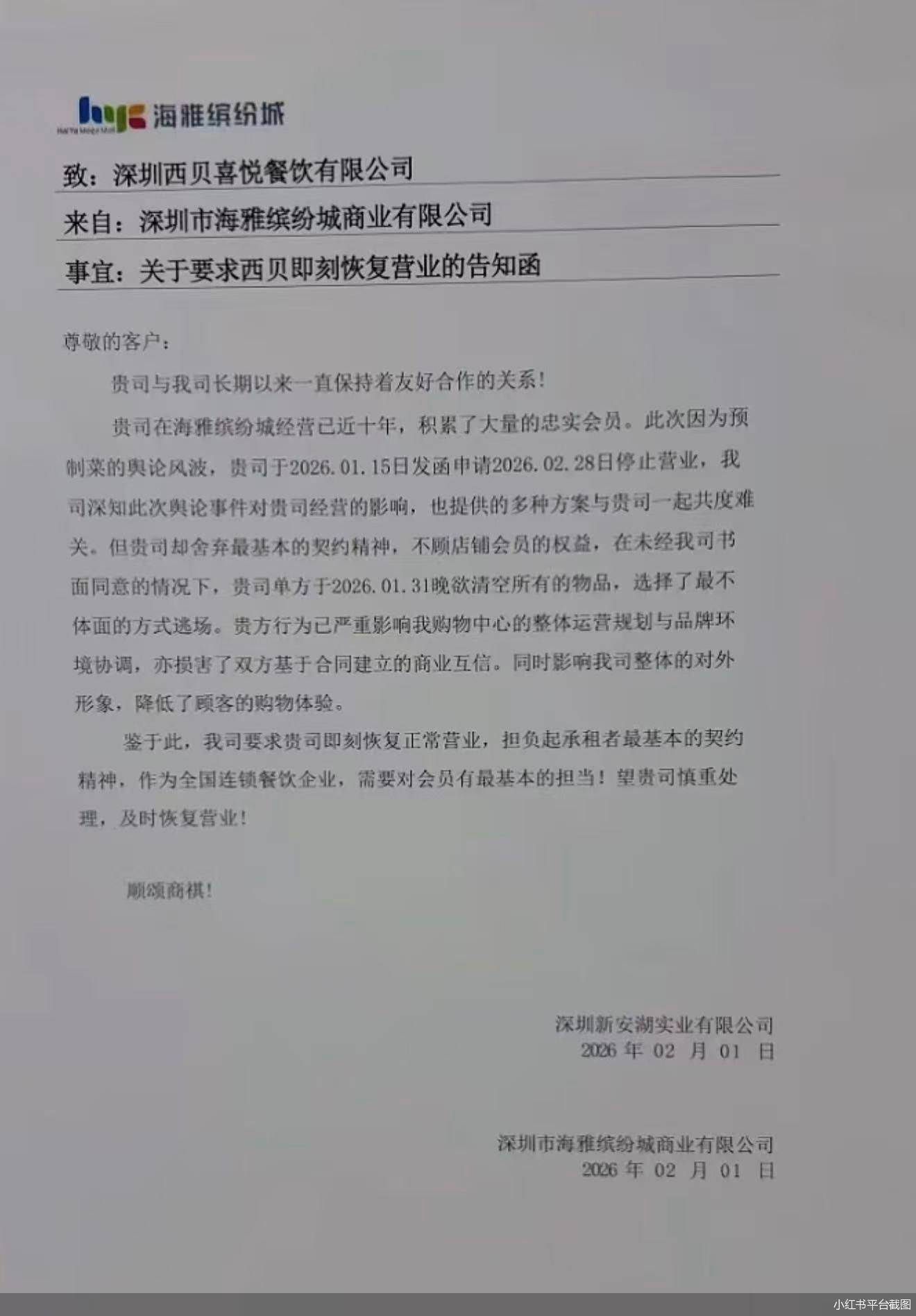 据了解,近日一张深圳某商场内张贴的《关于要求西贝即刻恢复营业的告知函》在社交平台流传。函中指出,西贝在此经营已近十年,此前因预制菜舆论影响,曾于1月15日申请2月28日停止营业。西贝在未获商场书面同意的情况下,于1月31日晚欲清空店内物品,被指采取“最不体面”的“逃场”行为,商场要求西贝立即恢复营业。