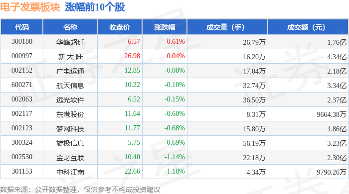 从资金流向上来看,当日电子发票板块主力资金净流出6.25亿元,游资资金净流入5966.22万元,散户资金净流入5.65亿元。电子发票板块个股资金流向见下表: