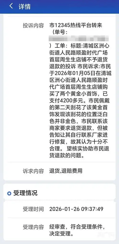 涉事消费者李女士介绍,她于2026年1月5日在广东省清远市清城区远盈时代广场的周生生店购买首饰。当天她与妹妹一同前往该店,共购买了三款黄金饰品,其中她个人花费4215元,购入一个足金福袋挂坠(价格2306元)和一个足金小羊挂坠(价格1909元),妹妹则购买了一个同款足金福袋挂坠。