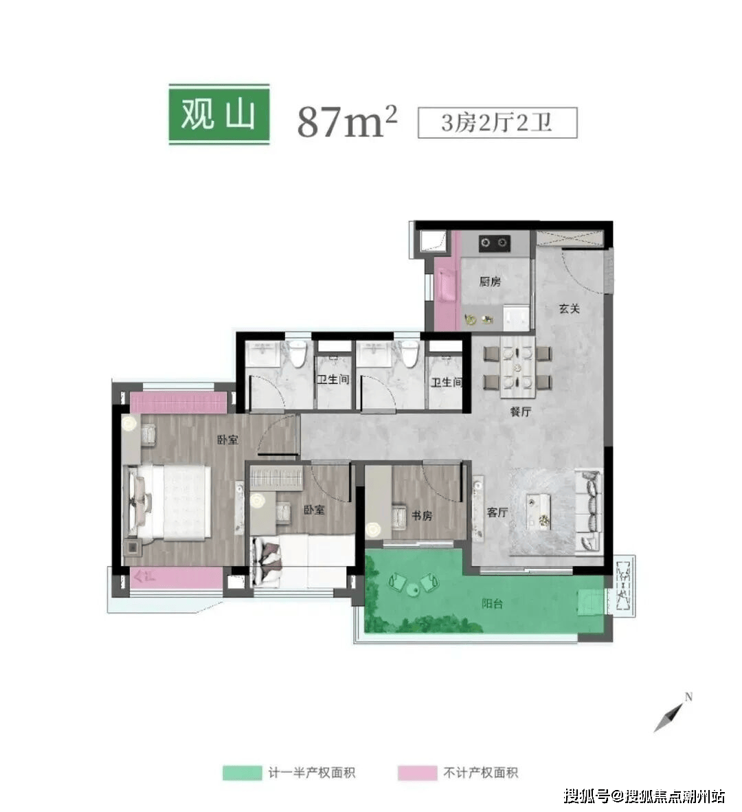 86/87㎡三房两卫,全南向四开间、三卧室朝南,南北通透,约5.6米L型大阳台,超11米南向展面