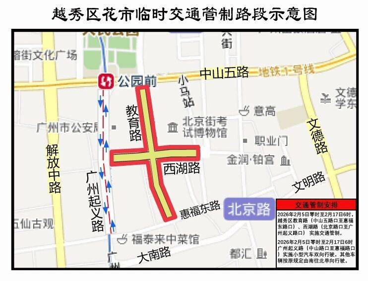 (一)2026年2月5日0时至2月17日6时,越秀区教育路(中山五路口至惠福东路口)、西湖路(北京路口至广州起义路口)。