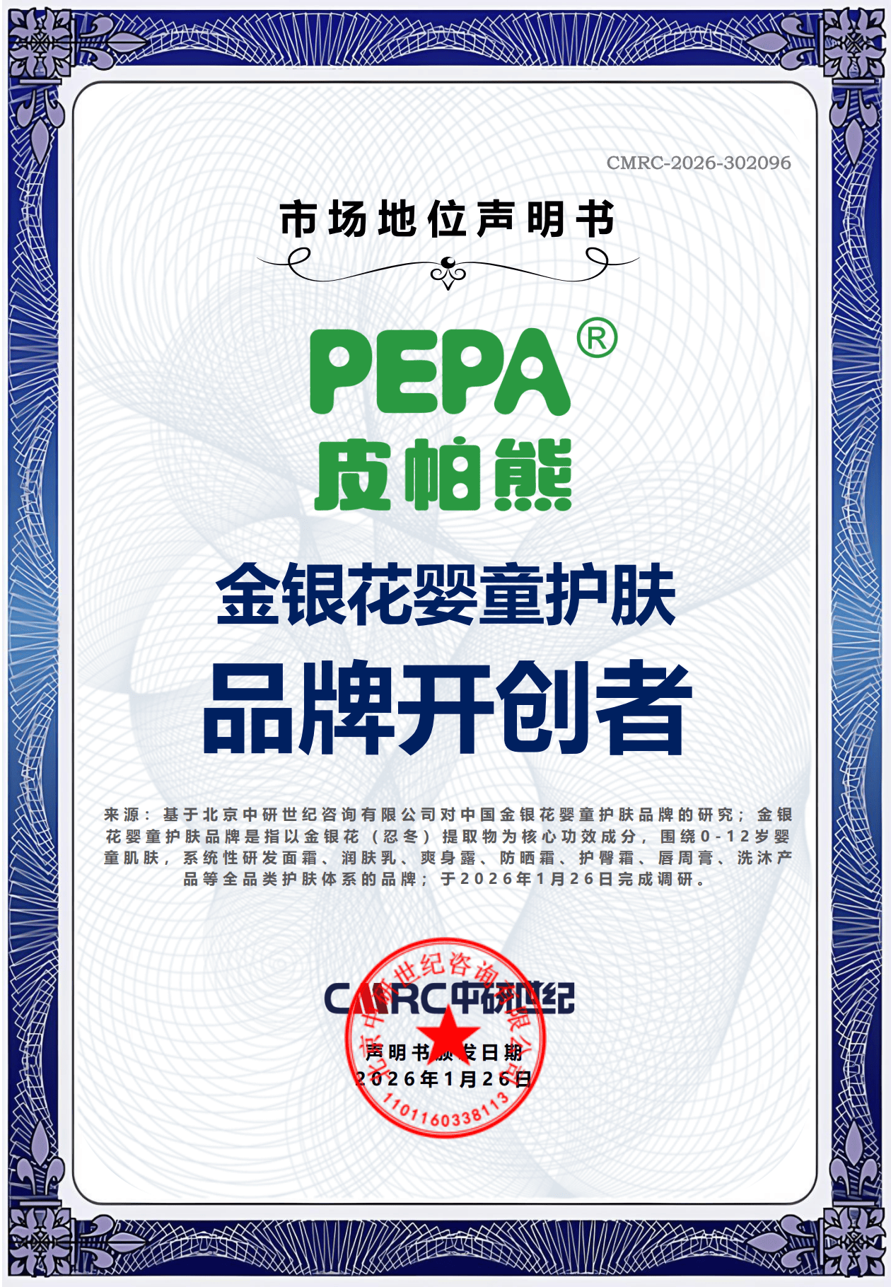 2026年1月,北京中研世纪对中国金银花婴童护肤行业进行专项调研与系统分析,确认皮帕熊“金银花婴童护肤品牌开创者”的市场地位。