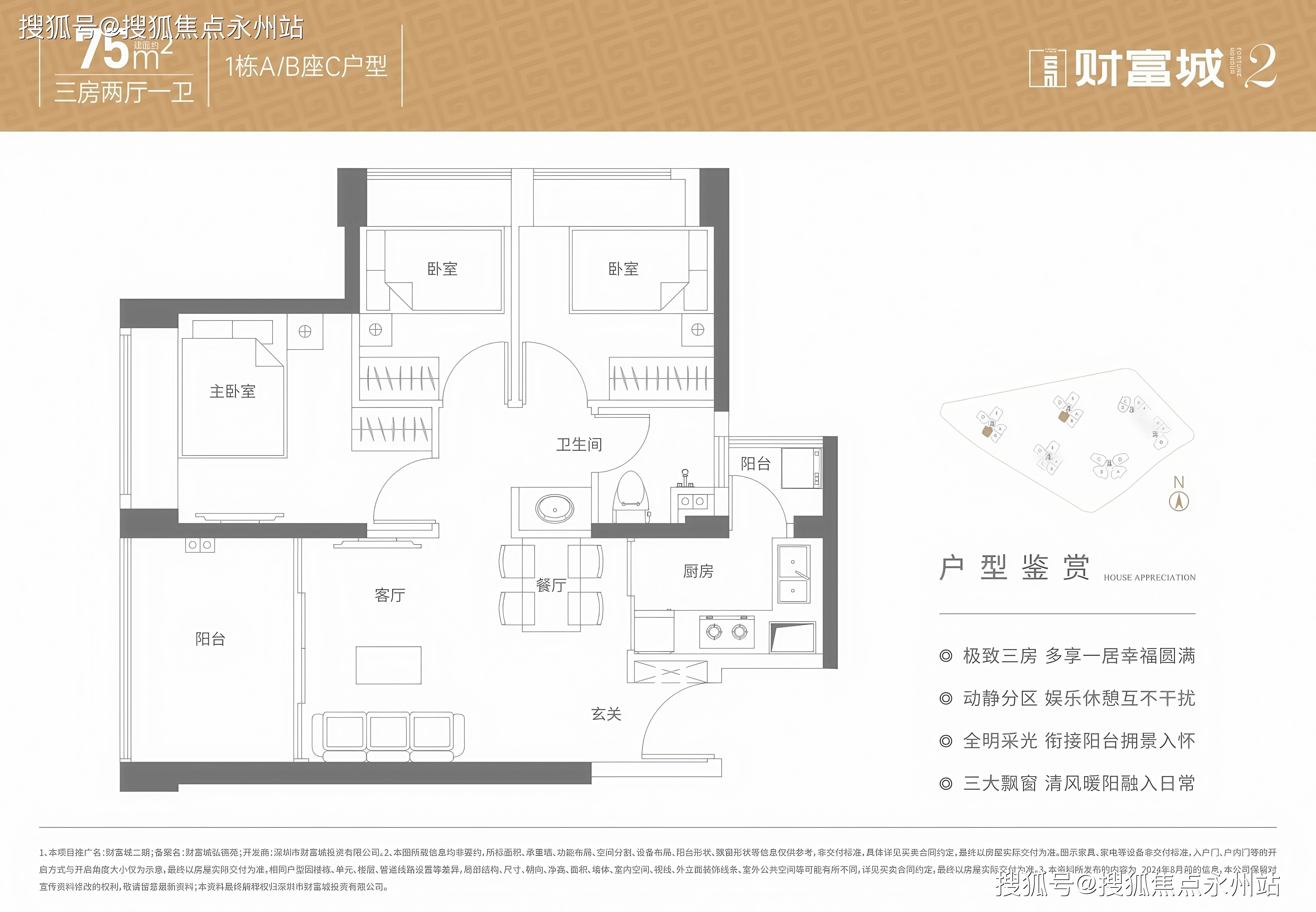 刚需首选:75㎡三房适合预算有限的年轻家庭,得房率高且功能齐全,折后总价约227万起。