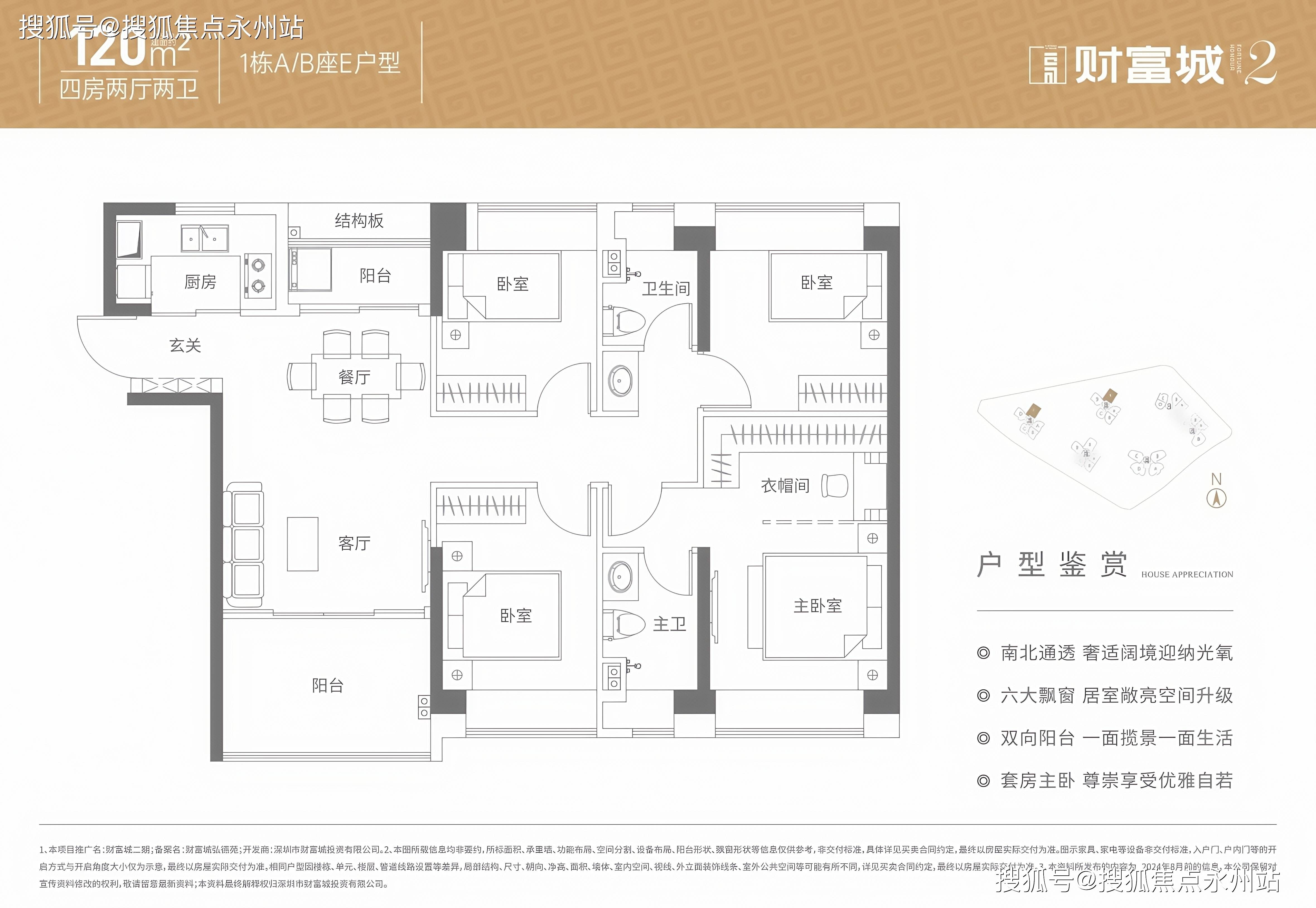 项目产品设计:全户型方正,户户双阳台 + 多飘窗,部分户型实现南北通透,3梯4户/3梯5户配置,标准层高2.9米,车位比1:1.05。