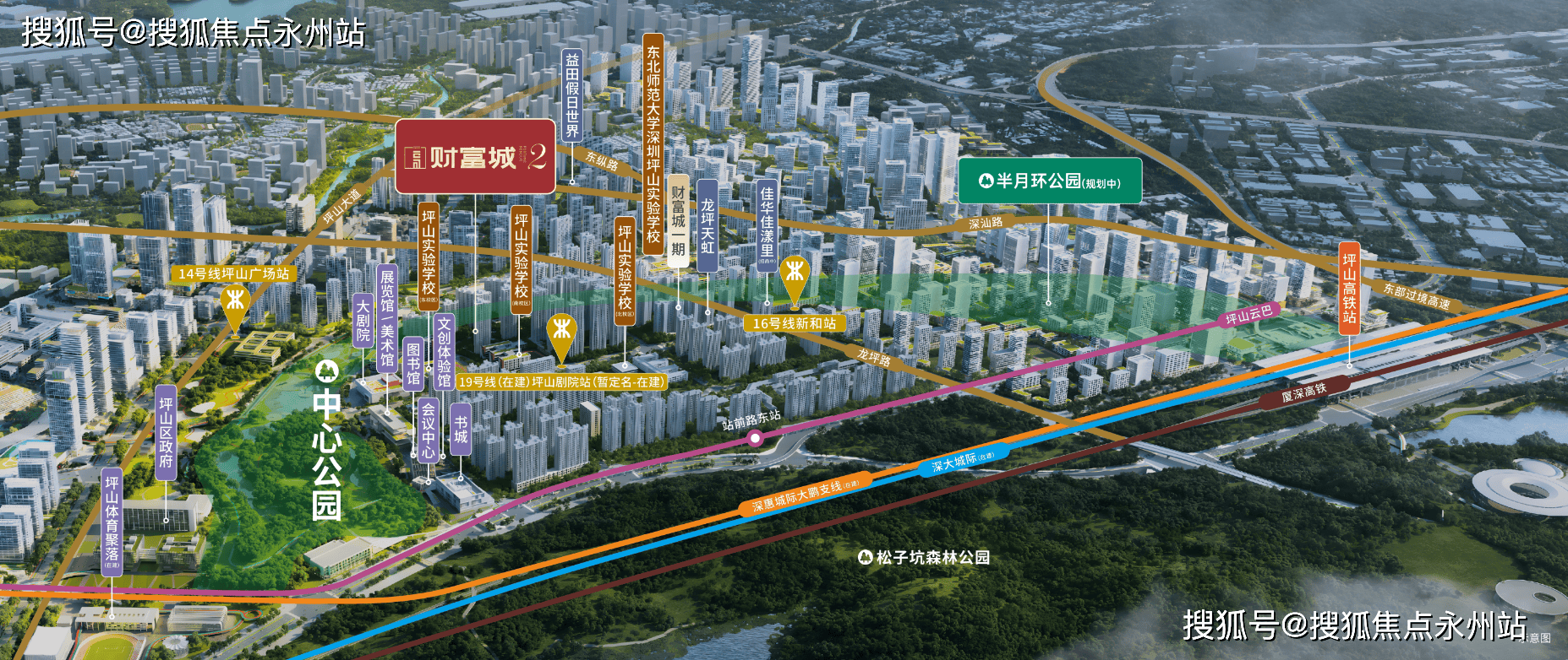 轨道交通:14号线坪山广场站(约400米)、16号线新和站(约700米)、19号线坪山剧院站(在建,约230米)三地铁环绕,6站直达大运、13站至福田中心区。
