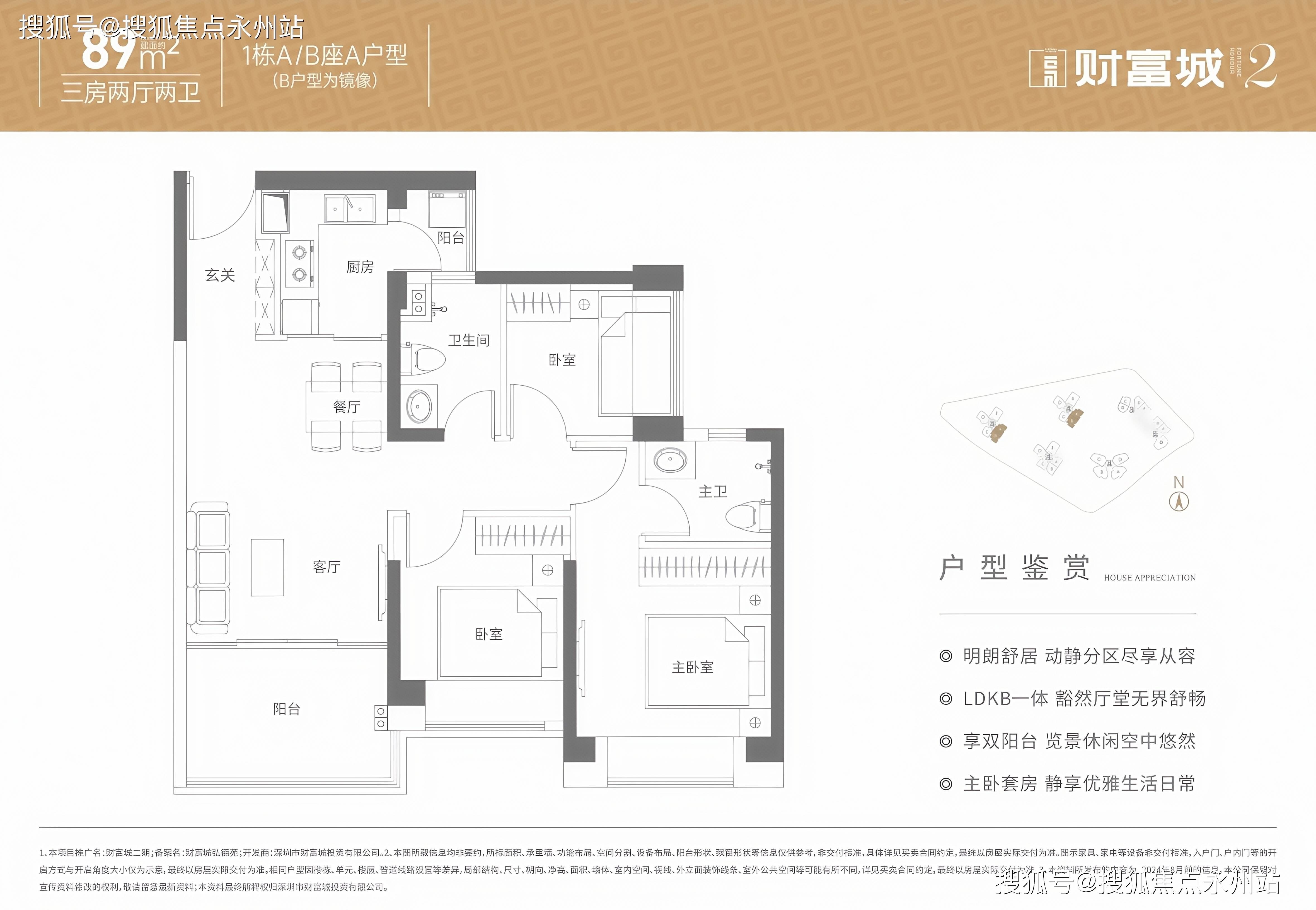 功能:双卫设计(主卧套房),L型厨房带生活阳台,得房率约86.13%(含赠送),西南、东南及东北朝向。