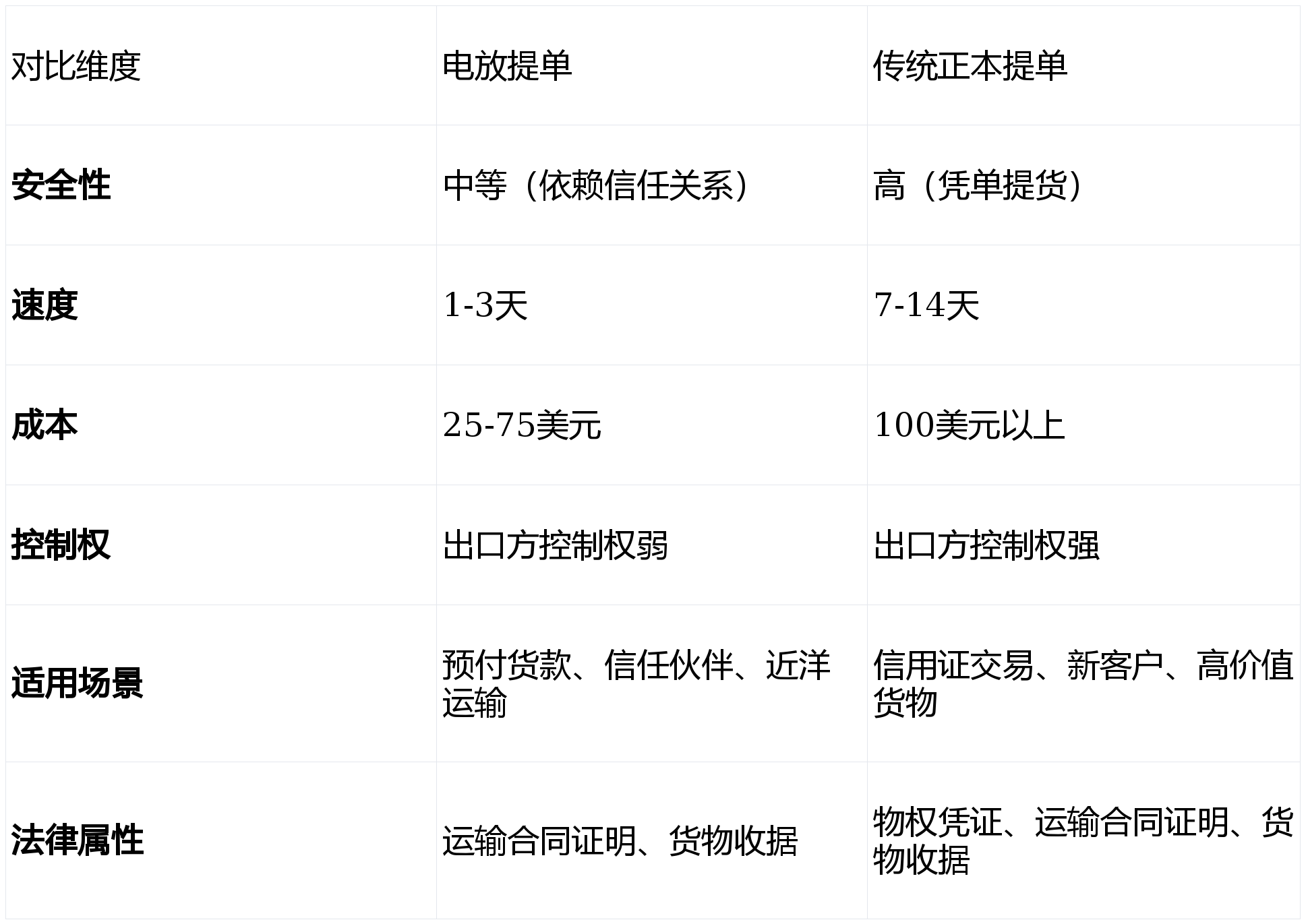 下面是电放提单与传统正本提单在不同维度的对比,可以帮助我们更清晰地理解两者的差异: