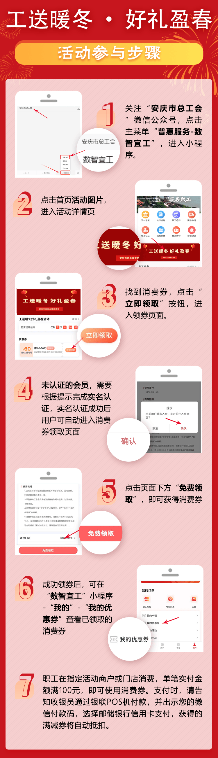 2026年2月6日9:00至7日23:59在“数智宜工”微信小程序领取消费券(满100-60元)。