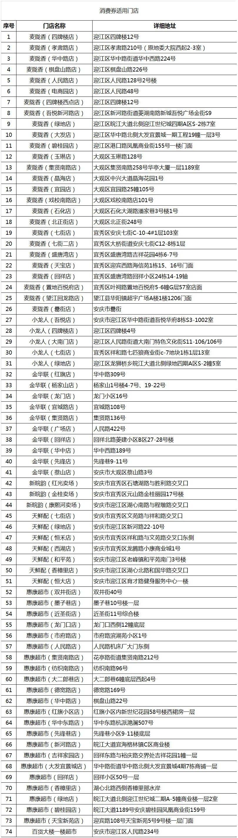 消费券活动商户:麦陇香、小龙人、金华联、新皖韵、惠康、百大超市(门店地址详见下方门店列表)