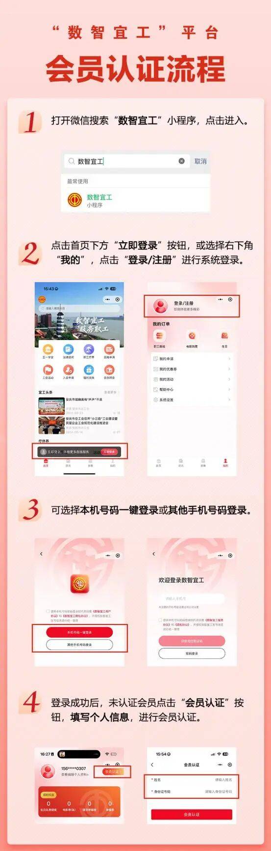 2. 尚未实名认证的职工会员,请及时在“数智宜工”小程序完成认证,以便第一时间参与活动。可以按照下面的流程进行认证操作。