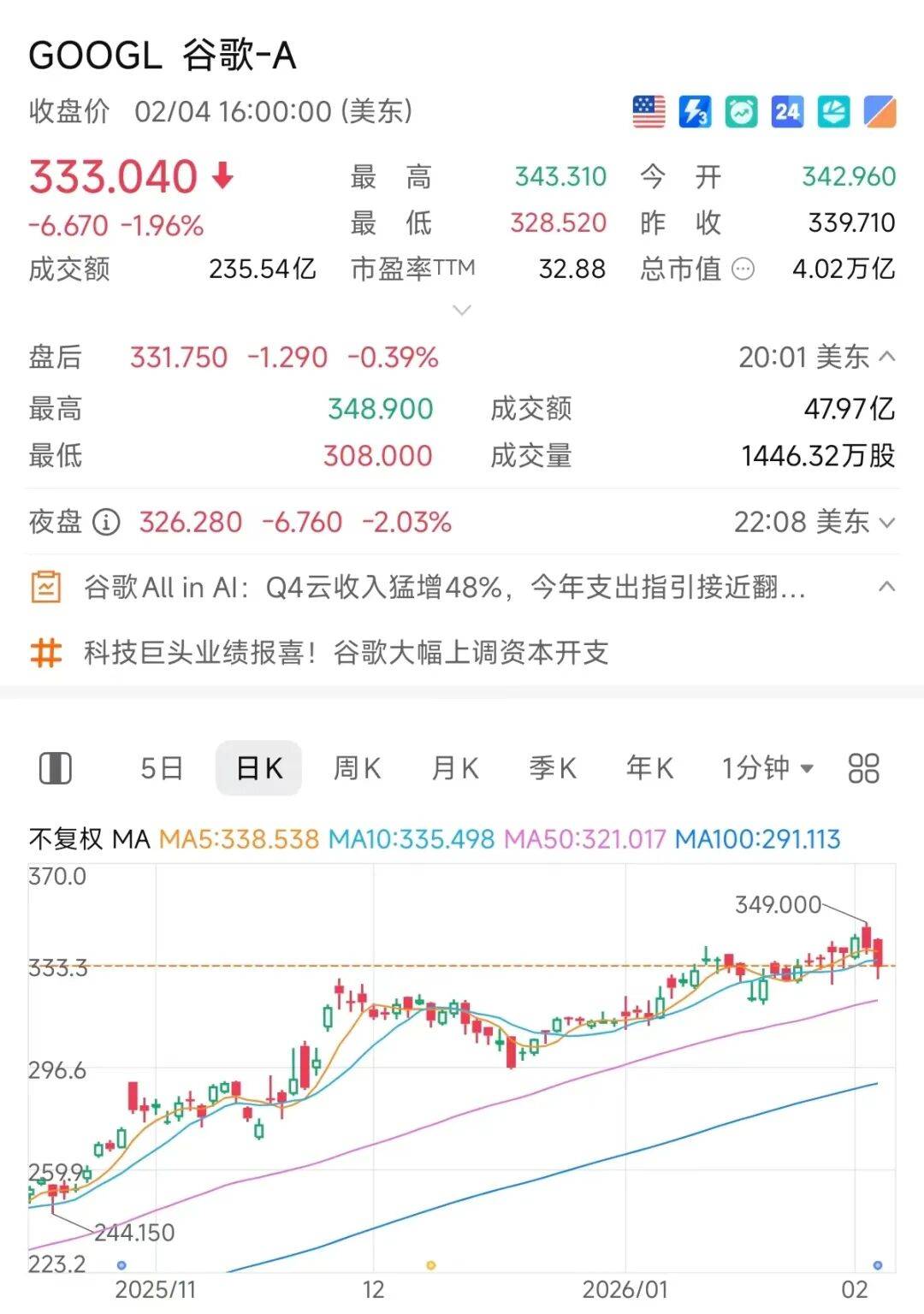 未来展望方面,CEO桑达尔·皮查伊预计,公司2026年全年资本支出将在1750亿美元至1850亿美元。相比2025年910亿美元的资本支出,该指引几乎翻倍,全面超越市场预期。财报发布后,谷歌股价波动剧烈。