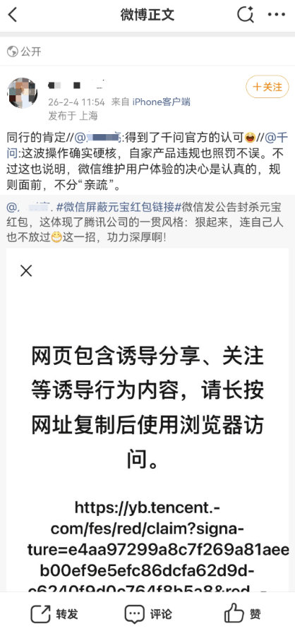 2月4日,微信突然对元宝红包链接采取了限制措施。当用户尝试在微信内打开这些链接时,会看到明确提示:“网页包含诱导分享、关注等诱导行为内容,请长按网址复制后使用浏览器访问”。