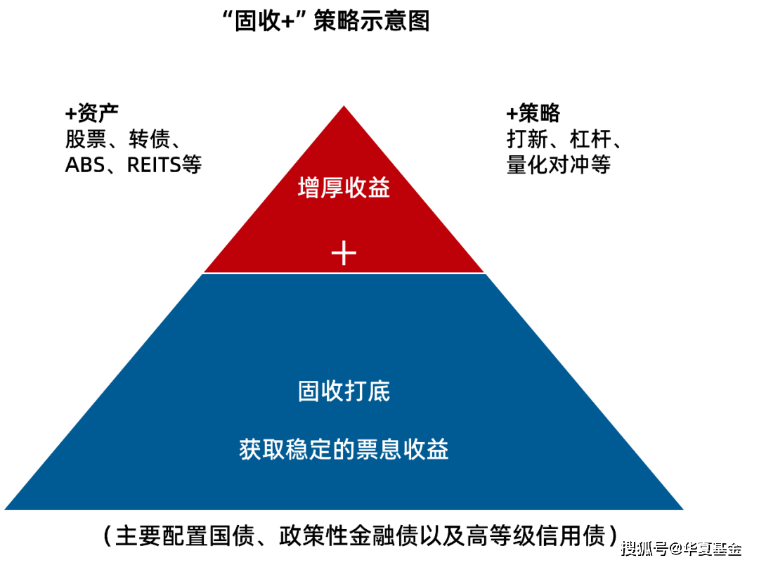 “固收+”顾名思义,“固收”是组合的底仓,以风险较低的债券类资产为主,争取基础收益并平滑波动;“增强”则是通过多种资产和多种策略力求增厚组合的整体收益。