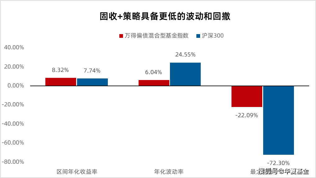 从历史长周期数据来看,2005年以来,以表征部分“固收+”策略基金的万得偏债混合型指数为例,过往历史年化收益超8%,超出沪深300指数,而年化波动率仅为6.04%,远低于沪深300指数。