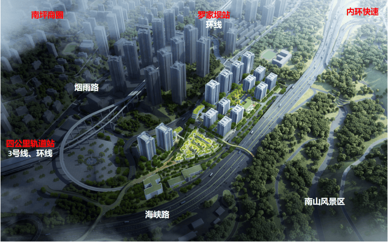 双轨交汇,3号线和环线,项目约250米环线罗家坝站,约600米就是四公里轻轨换乘站,3号线是穿越重庆南北,是重庆交通的大动脉,环线可以达到火车北站和火车西站,串联全城。