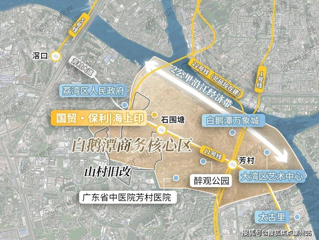 打开地图可以看到,项目处在白鹅潭CBD核心区、芳村大道以北2公里黄金沿江带。