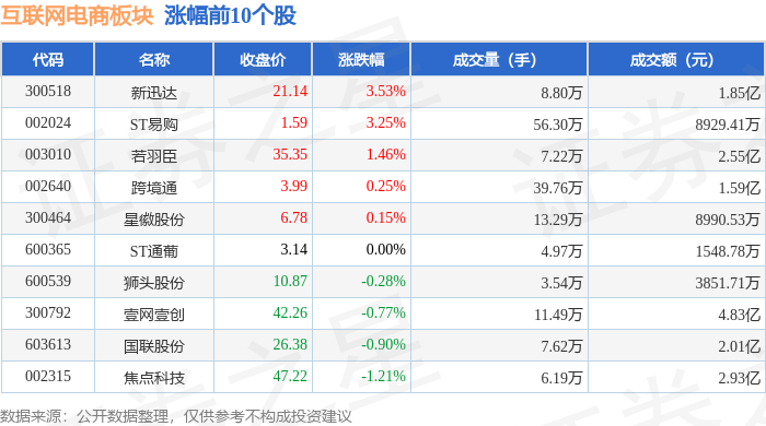 从资金流向上来看,当日互联网电商板块主力资金净流出1.4亿元,游资资金净流出5558.73万元,散户资金净流入1.96亿元。互联网电商板块个股资金流向见下表: