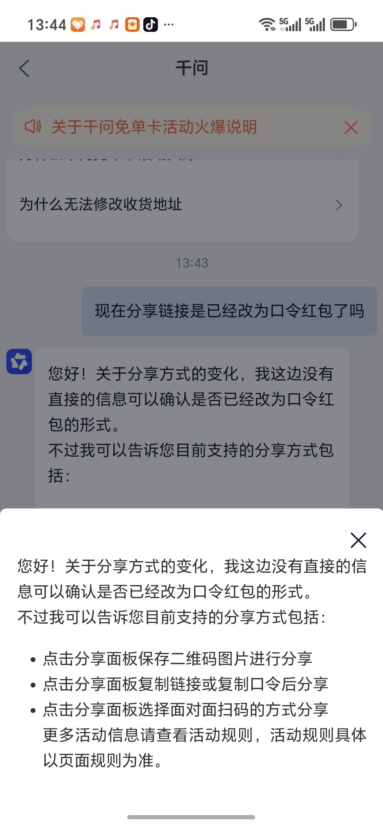 对此,中新经纬询问千问APP客服红包分享是否已改为口令红包,客服回应表示,目前支持的分享方式包括三种:进行分享,点击分享面板复制链接或复制口令后分享,以及点击分享面板选择面对面扫码的方式分享。