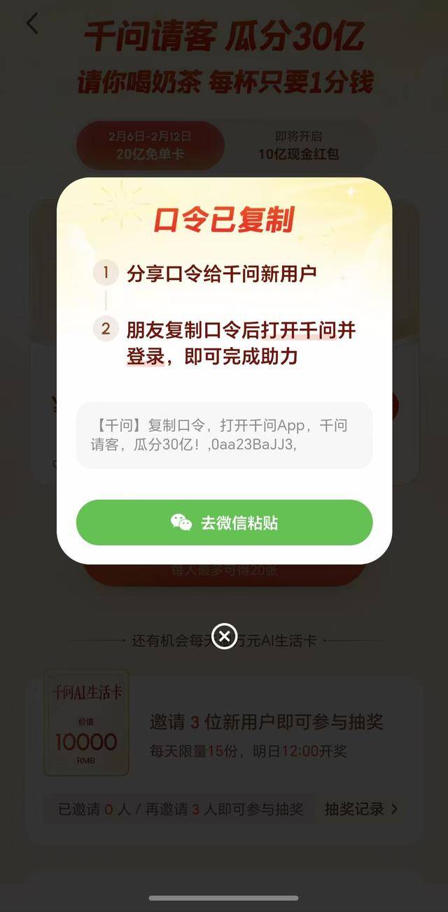 中新经纬2月6日电 6日,千问APP正式上线“春节30亿免单”,发放奶茶免单卡。其微信分享链接被微信屏蔽,客服回应表示,目前支持分享二维码、口令以及面对面扫码等三种分享方式。