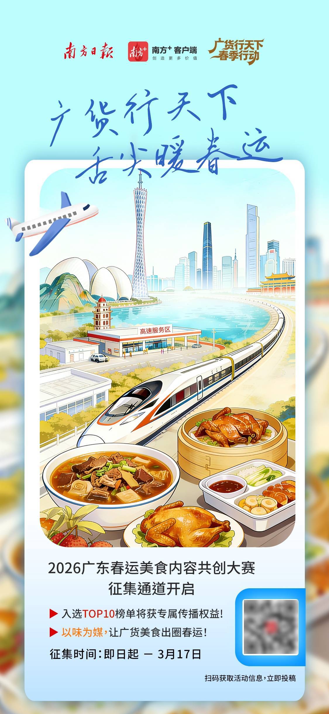 即日起,“广货行天下,舌尖暖春运”内容共创大赛正式面向全省春运美食相关的经营主体和广大网友发出邀约,邀你化身美食推荐官,用精彩短视频,捕捉春运路上的广东风味与温情瞬间,让每一份舌尖上的感动,都成为春运最动人的注脚。让归途中的各色美食,成为春运路上最暖的注脚。()