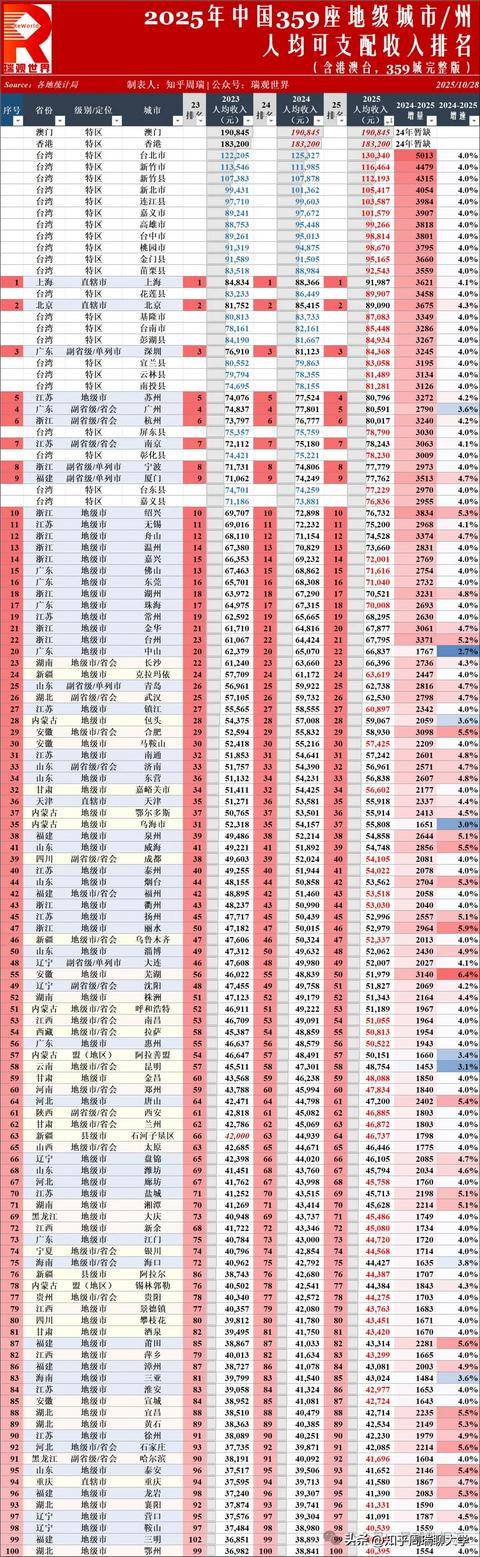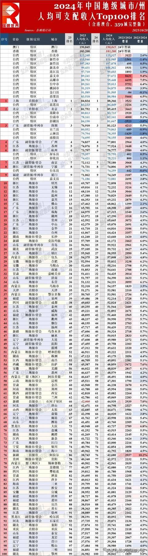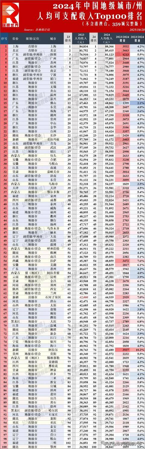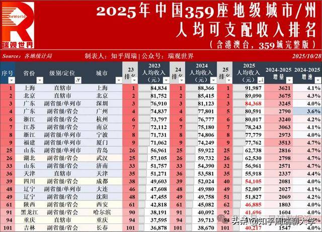 人均可支配收入从来不是冰冷的数字,而是衡量城市民生温度的核心标尺 —— 它直接反映居民的真实购买力、生活质量,更折射出一座城市的产业活力与分配效率。当 2025 年中国 359 座城市的人均可支配收入榜单出炉时(截至2月4日只有154城公布最新数据,本文仅列出前100,我们将持续更新),我们看到的不仅是财富的阶梯,更是中国经济从 “高速增长” 迈向 “高质量发展” 的民生注脚:上海突破 9 万元大关,北京逼近 9 万,广州被苏州反超,东部城市群的财富高原与内陆城市的孤峰并存,每一个位次的变动都藏着城市竞争的深层逻辑。