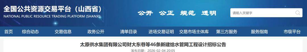 《太原供水集团有限公司财大东巷等46条新建给水管网工程设计招标公告》显示,本招标项目已由项目审批/核准/备案机关批准,项目资金来源为积极争取上级资金,剩余部分由地方和企业自筹解决,招标人为太原供水集团有限公司。本项目已具备招标条件,现进行公开招标。