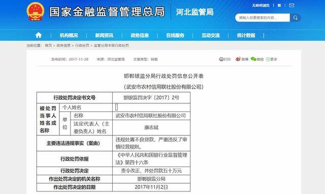 值得注意的是,武安市农信社曾多次因信贷违规受罚。2017年11月,武安市农信社被查获“违规处置不良贷款,严重违反了审慎经营规则”的违法违规行为,被处以责令改正并罚款50万元处罚。该社时任法定代表人康志斌同时被罚款7万元。