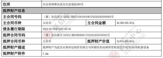 据央行征信中心动产融资登记信息披露,武安市农信社2024年2月向某制管公司发放了一笔4900万元的抵押贷款,贷款期限为三年,贷款抵押物为该制管公司拥有的182项机器设备,抵押物价值合计仅1664.39万元,风险敞口超过3200万元。