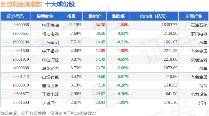 自由现金流(980092)指数十大成份股详情如下: