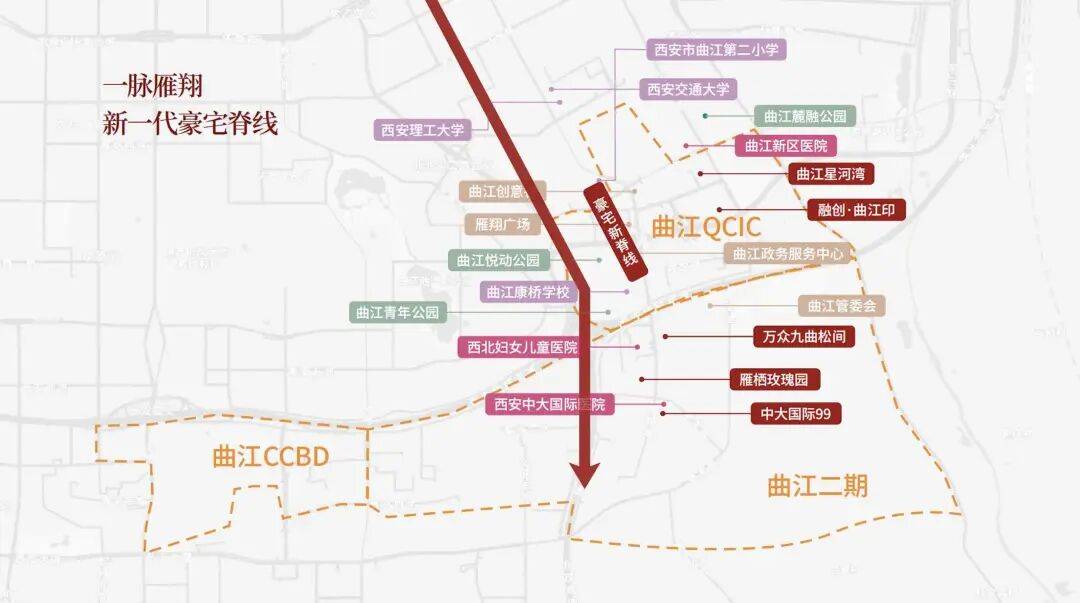 作为曲江新区“豪宅+地王”品质外溢的主力板块总占地2.9平方公里,重点聚焦终端改善型产品,总投资78亿打造“文化+科技+教育”多产业融合人文居住区曲江和金茂强强联合,打造曲江新脊线,依托雁翔路形成多组团豪宅群弥补曲江一期全新生活方式居住空白