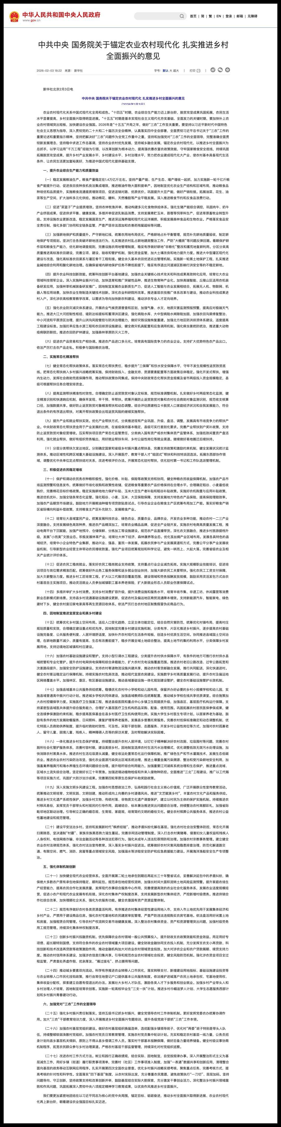 2026年中央一号文件《关于锚定农业农村现代化 扎实推进乡村全面振兴的意见》已于2月3日发布。