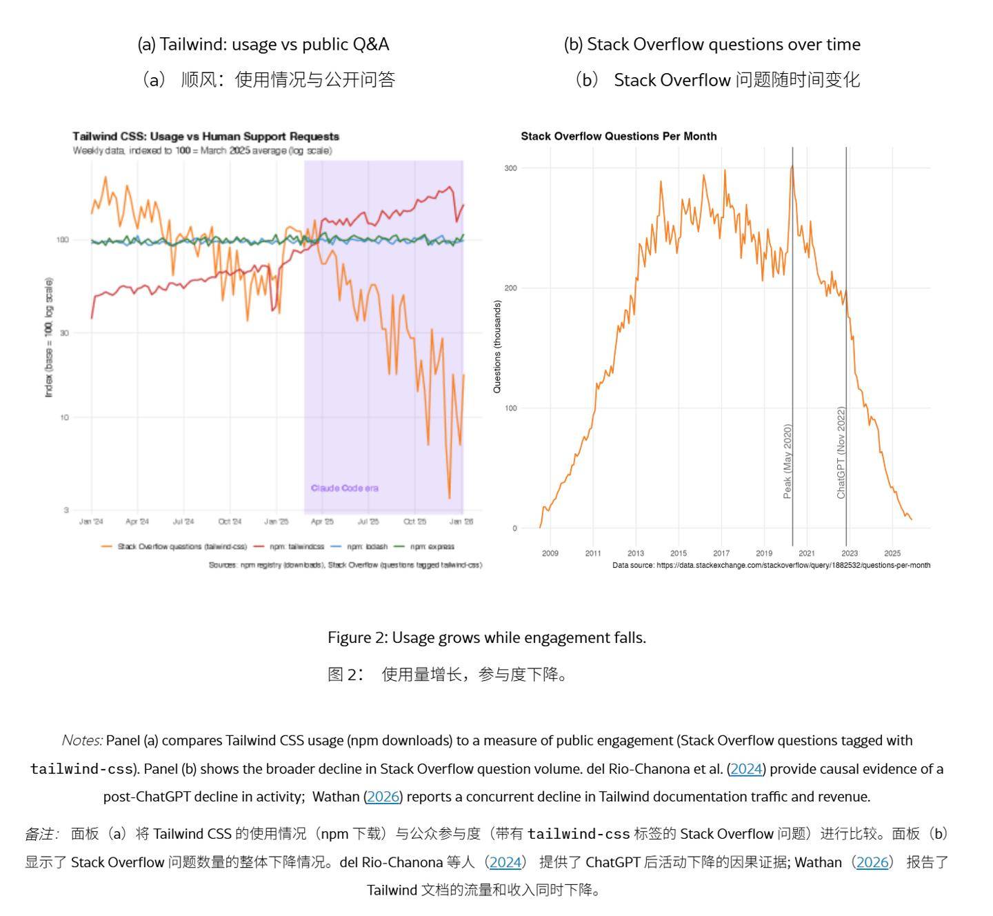 与此同时,Stack Overflow 等技术问答平台的流量也大幅下滑。这种背离现象表明,AI 工具正在“偷走”本应属于开源维护者的注意力红利,将原本的社区互动转化为封闭的模型推理过程。