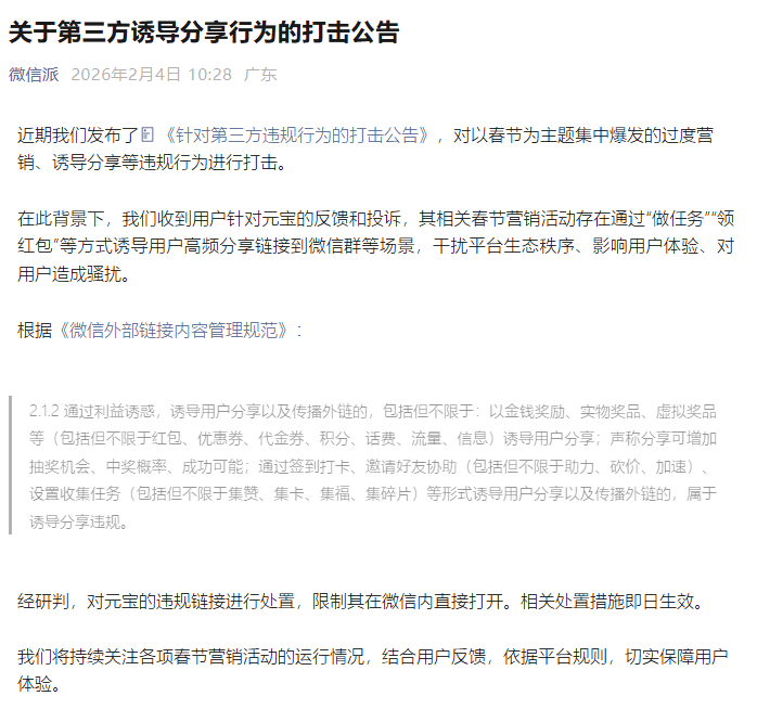 在此背景下,我们收到用户针对元宝的反馈和投诉,其相关春节营销活动存在通过“做任务”“领红包”等方式诱导用户高频分享链接到微信群等场景,干扰平台生态秩序、影响用户体验、对用户造成骚扰。经研判,对元宝的违规链接进行处置,限制其在微信内直接打开。相关处置措施即日生效。