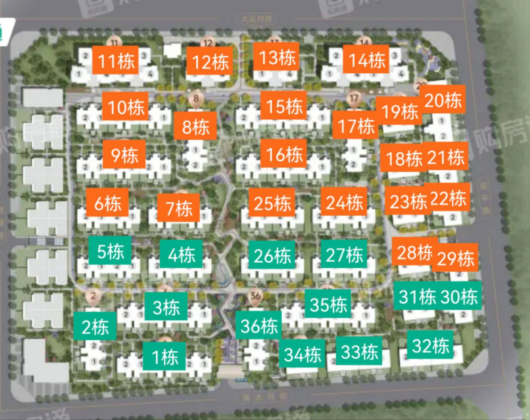 别墅:在售1-5栋、26/27栋、30-36栋,待售6-10栋、15-25栋、28/29栋。