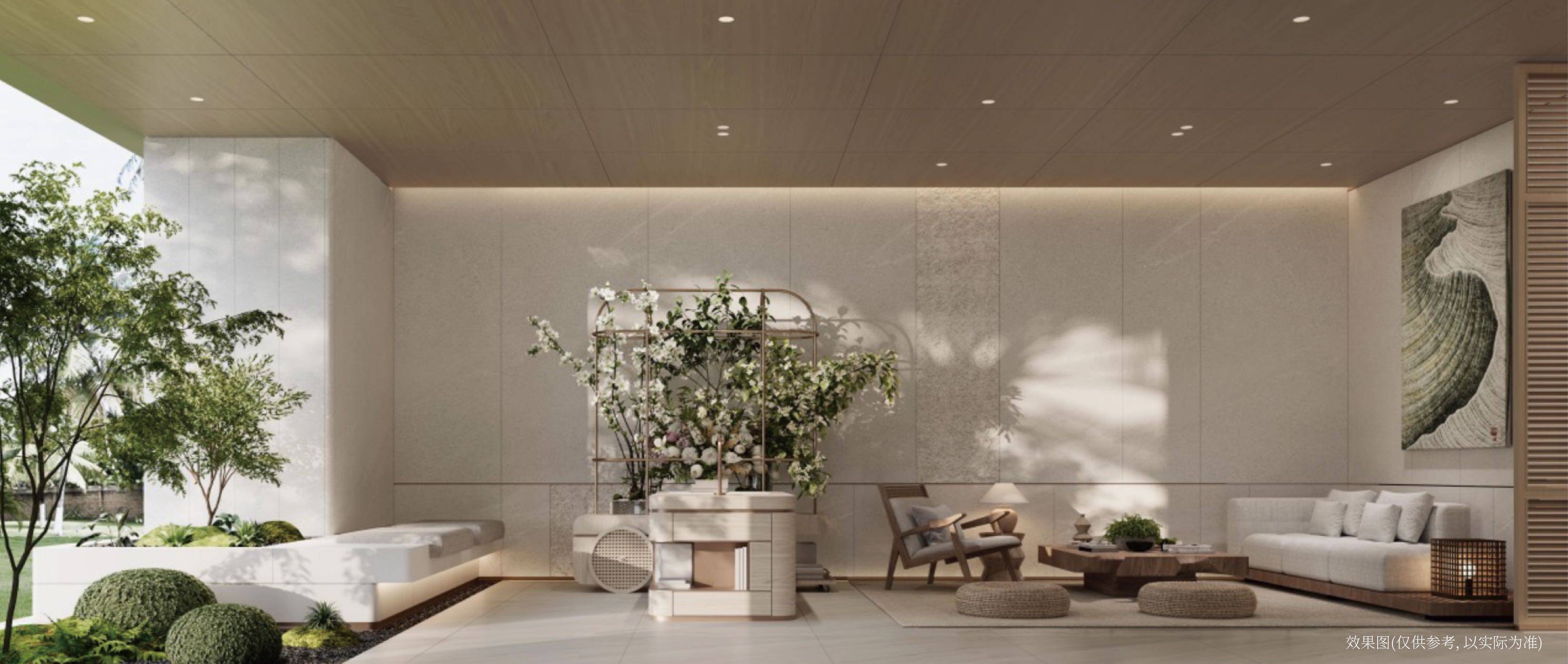 以「檐下LOUNGE」为概念展开的全区架空层功能交互空间,巧妙地与园林美景无界融合,打造健身房、瑜伽室、儿童活动区、休闲书吧、会客茶室、颐养健身等全龄生活空间,实现长居与度假双类需求的共融互通。