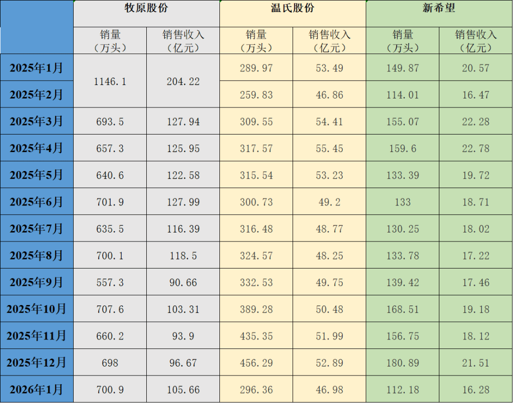 三大上市猪企牧原股份(002714.SZ)、新希望(000876.SZ)、温氏股份(300498.SZ)近日发布2026年1月生猪销售情况。
