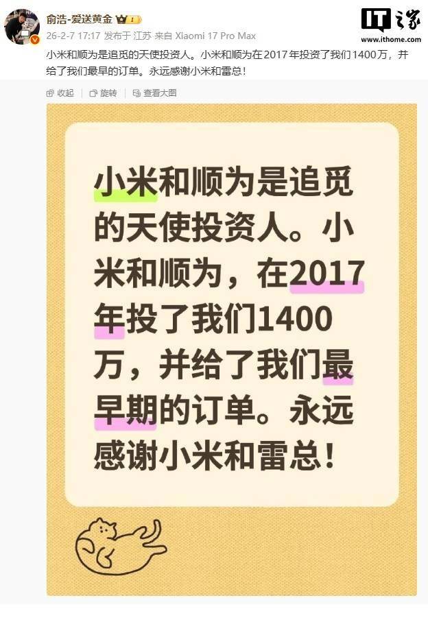 IT之家 2 月 7 日消息,追觅 CEO 俞浩发微博称:小米和顺为是追觅的天使投资人。小米和顺为在 2017 年投资了我们 1400 万,并给了我们最早的订单。永远感谢小米和雷总!