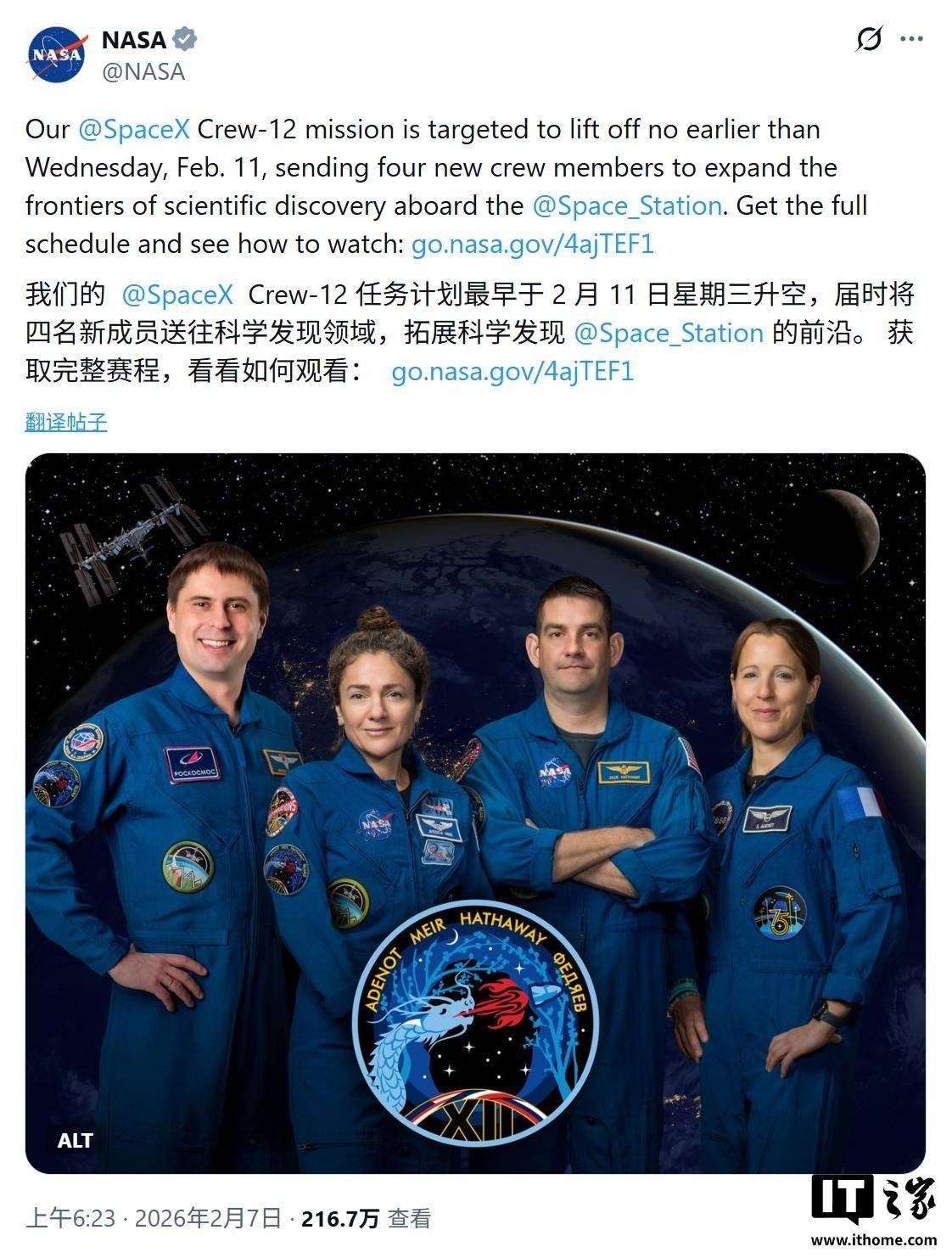 IT之家 2 月 7 日消息,科技媒体 Phys 今天(2 月 7 日)发布博文,报道称美国宇航局计划格林威治标准时间 2 月 11 日周三 11 点 01 分(北京时间周三 19 点 01 分),通过 SpaceX 猎鹰 9 号火箭发射 Crew-12 任务,将 4 名宇航员送往国际空间站(ISS)。