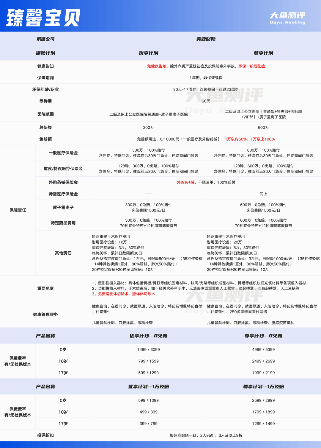 美亚的臻馨宝贝有两个计划,一个普通部计划,一个特需国际部计划,特需部计划直接选择无社保费率投保,否则无论什么原因都有60%罚则。等待期有60天,比较特殊;就医医院和众民保百万类似,没有扩展医院,仅限二级及以上公立和全部的质子重离子医院;并且臻馨宝贝还支持外籍投保。