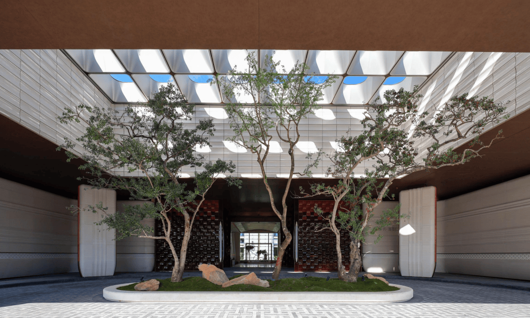 两侧进口油橄榄苍劲列植,既呈现雕塑般的艺术姿态,又将古希腊智慧与和平的隐喻引入归家仪式,赋予空间国际化的优雅与从容。