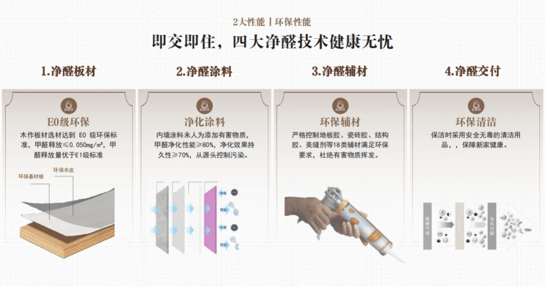 从主材、涂料,到辅料、清洁,构筑了一条完整、闭环的健康防线,实现真正的“即交即住”的承诺。